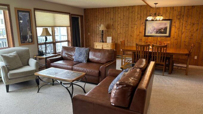 Accommodations are delivered in spacious 2-bedroom, and 2-bedroom + loft layouts (up to approx. 1,300 sq ft) that feel like home in the mountains. Each suite features a full kitchen, gas fireplace, separate living and dining areas, private deck with scenic views, and in-unit laundry (in many units). Living here means both comfort and convenience in one package.