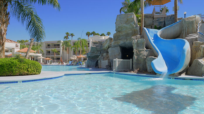 Discover the ultimate oasis in Palm Springs! Surrounded by tropical landscaping and a serene atmosphere, Palm Canyon Resort and Spa truly feels like a lush haven among the desert. The 1.5 acre pool and sundeck are surrounded by dramatic rock formations and cascading waterfalls, feeling like a hidden grotto. An in-cave whirlpool hot tub can also be found, and a water slide weaves among the rocks. In addition, guests are invited to take advantage of the game room, fitness center, and indoor basketball and volleyball courts. And of course, the onsite Canyon Spa offers a host of services including a variety of massage treatments, facials, manicures, pedicures, body scrubs, and wraps.