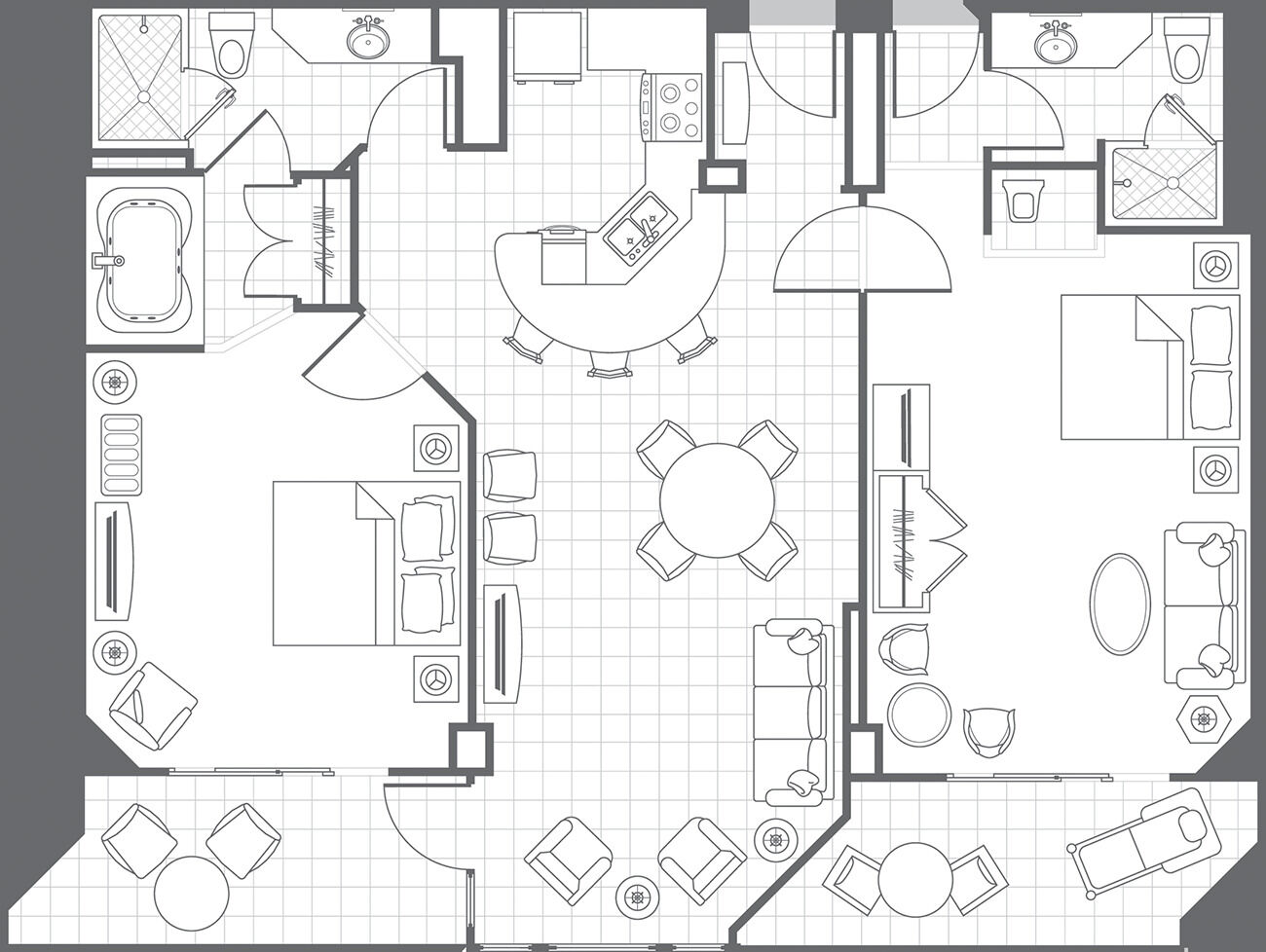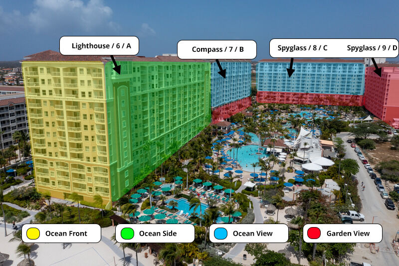 The resort is composed of three towers - Lighthouse, Compass, and Spyglass. The Lighthouse Tower is closest to the beach, with units being designated as oceanside. The Compass Tower is home to all the resort's three-bedroom units, as well as the resort's main lobby and marketplace. The Spyglass Tower is the newest of the three, located on the back of the property. Some of these units have ocean views, while most have garden views overlooking the lazy river.