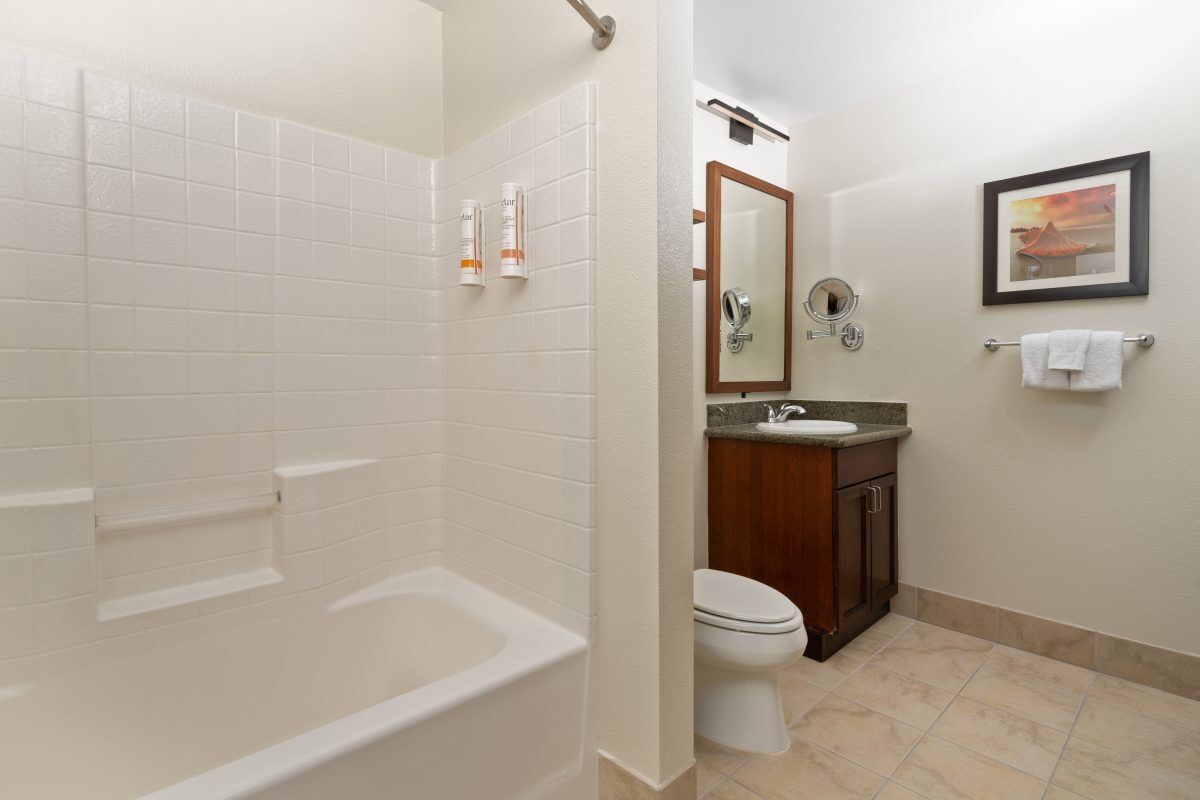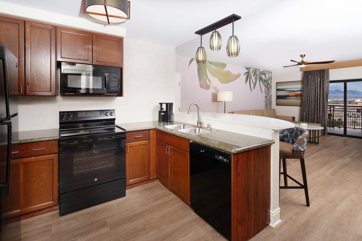 Accommodations at Tahiti Village include spacious one- and two-bedroom suites, each thoughtfully designed with rich woods, granite finishes, and comfortable plantation-style furnishings. Suites feature either a kitchenette or full kitchen, separate living and dining areas, sleeper sofas, and private bedrooms. Guests also enjoy modern conveniences such as flat-screen TVs, DVD players, and complimentary Wi-Fi, with some units including in-room laundry and jetted tubs for extra comfort. Whether for a romantic weekend or a family getaway, these suites provide a welcoming retreat from the bright lights of the city.