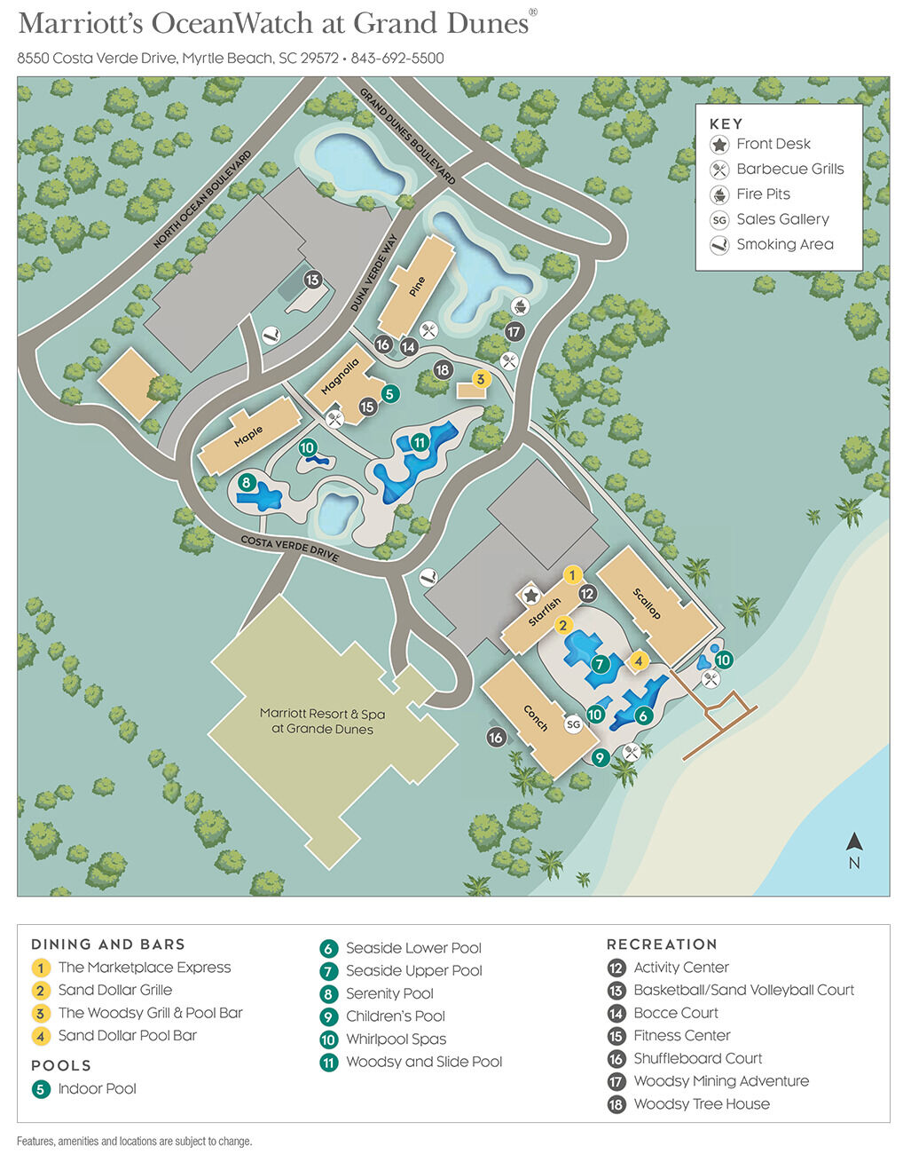 Experience the perfect blend of beachfront fun, and relaxation at Marriott's OceanWatch Villas at Grande Dunes in Myrtle Beach! Located on the golden shores of the Myrtle Beach oceanfront, this resort offers stunning views of the ocean or lush gardens from your villa's private furnished balcony. Soak up the sun by one of the outdoor pools or enjoy direct access to the beach. Stay active at the resort's state-of-the-art fitness center, while kids have a blast at the outdoor playground. Improve your golf game on the putting green or try fun activities like volleyball, shuffleboard, and table tennis. When you're feeling hungry, grab a bite to eat at the selection of casual restaurants and pool bars.