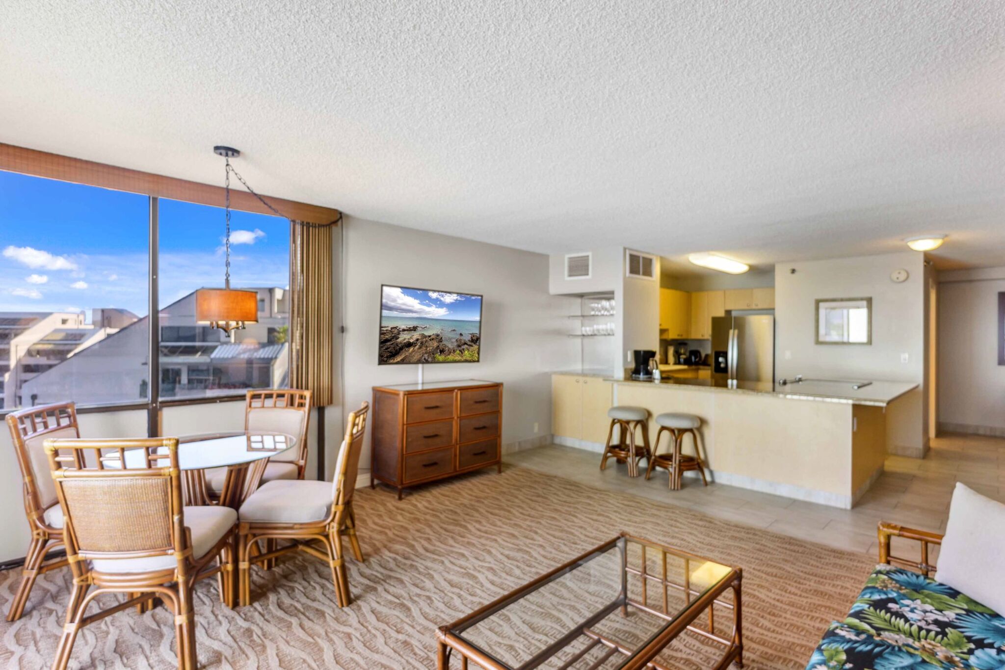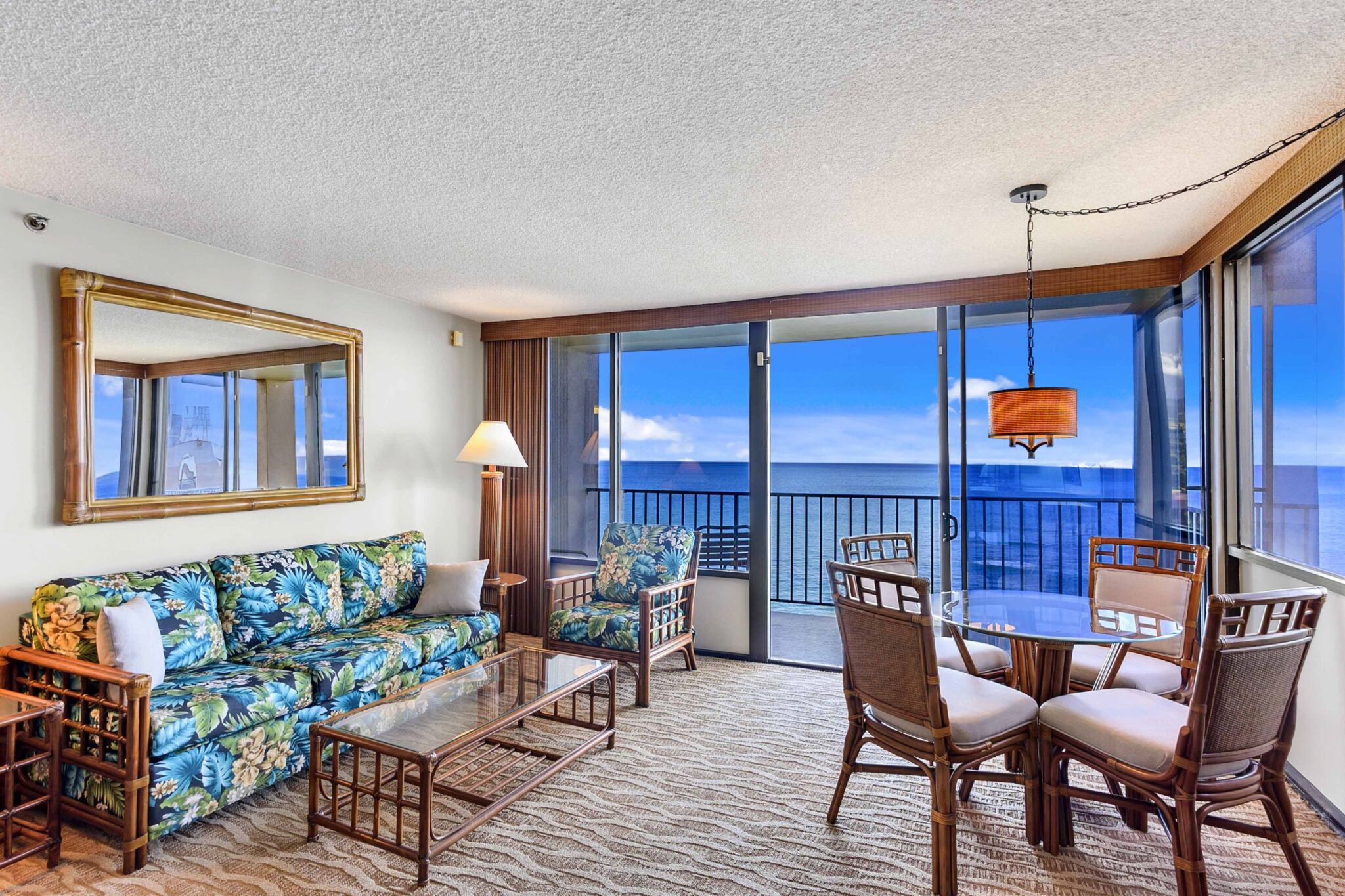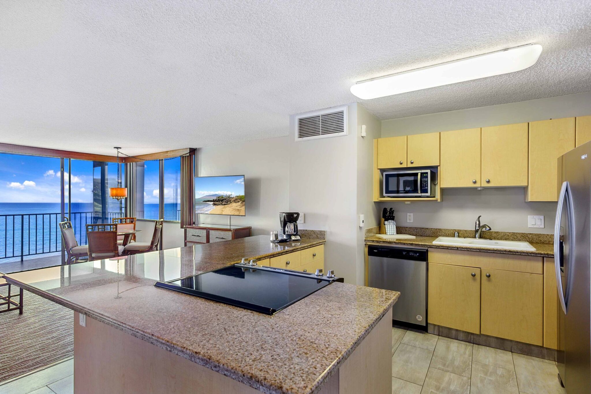 Studio units and one-bedroom suites are decorated with light, airy, natural finishes in blonde woods, bamboo, shell stone and granite. The furniture is accented with comfortable Hawaiian fabrics. The one-bedroom's kitchen features a glass cook top, oven, refrigerator, microwave, cabinet storage and cookware for a "just-like-home" cooking experience. Take in the glorious Hawaiian sunrises and sunsets from your own private lanai.
