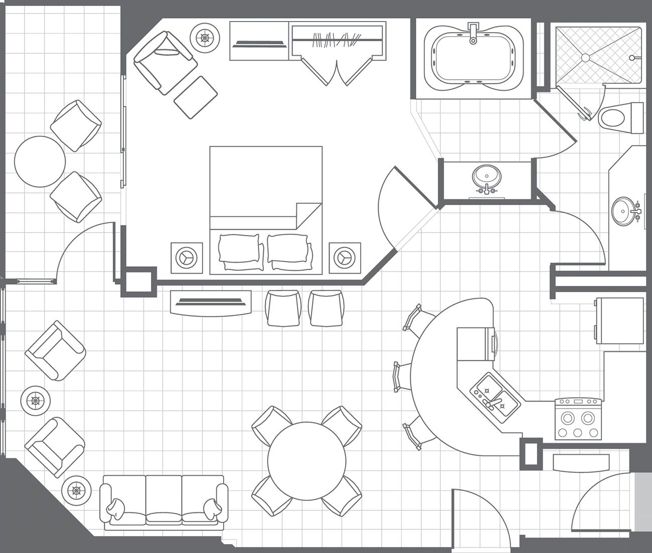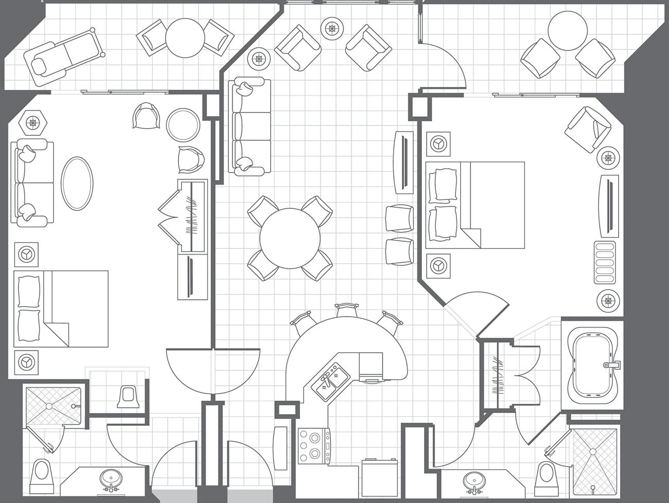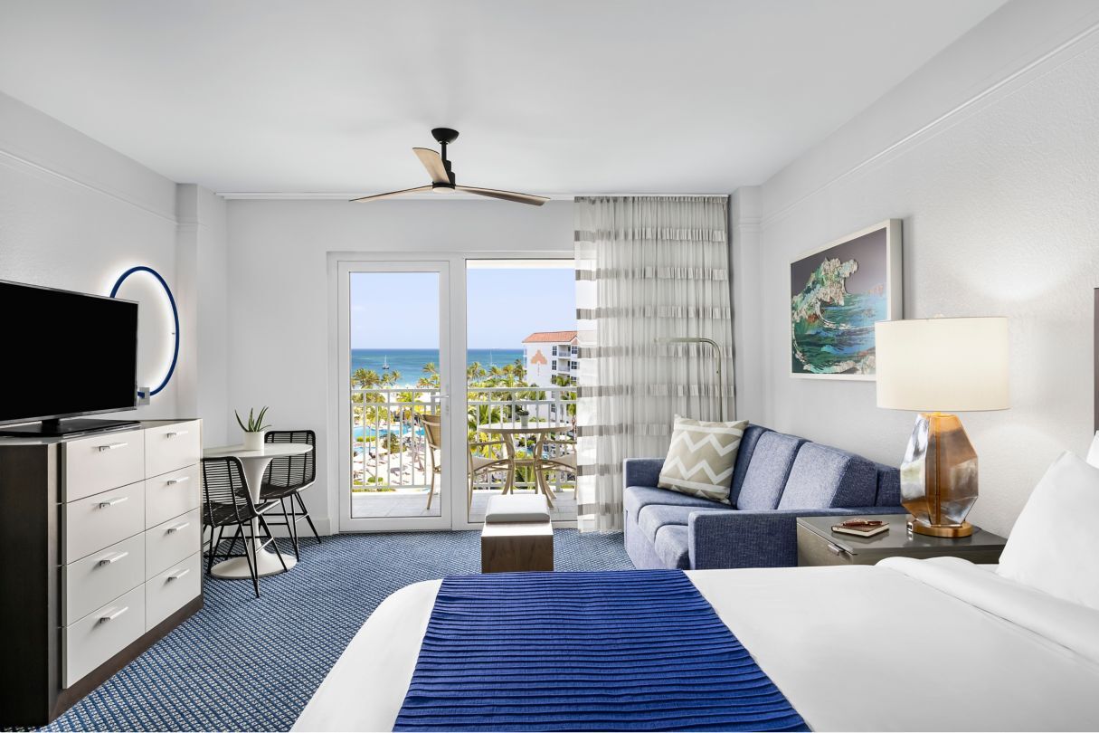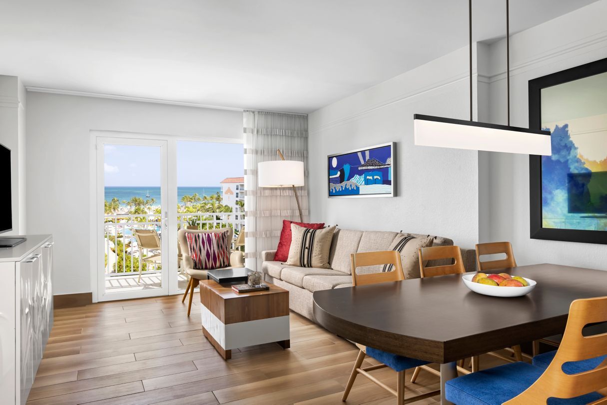 The spacious villa-style accommodations at Marriott's Aruba Ocean Club offer a perfect blend of luxury and convenience for families and couples alike. Each one- and two-bedroom vacation villa features a fully equipped gourmet kitchen, separate living and dining areas, and a private furnished balcony with breathtaking views of the Caribbean Sea or lush tropical resort gardens. Villas also include modern amenities like complimentary high-speed Wi-Fi, in-unit washers and dryers, and flat-screen HDTVs in every room.