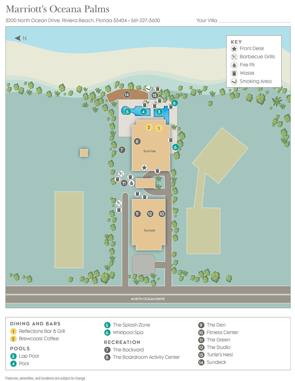 Nestled on the pristine shores of Singer Island, Marriott's Oceana Palms offers incomparable views of azure water edged in ribbons of sand. Get ready for vacation dreams to come true with a five-star location as well as an impressive array of amenities at hand. Unwind in either of the two swimming pools or the whirlpool spa, while children will enjoy the Splash Zone with interactive water features. The resort offers a shuffleboard court, fitness center, play area with climbing wall, and daily activities program for all ages. When you're feeling hungry, stop by Reflections for outdoor dining overlooking the pool and beach, or grab quick snacks, Starbucks coffee or ice cream from The Marketplace.