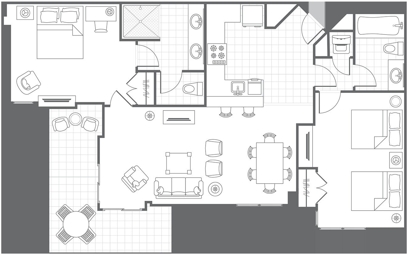 At Marriott's Oceana Palms, guests can expect unparalleled comfort and convenience with two-bedroom, two-bathroom villas. Each comes fully outfitted with fully-equipped kitchens, open and spacious floorplans, 40" flat-screen TV's with Blu-ray players, plush kind beds in the master suite, oversized shower with dual showerheads, in-villa washer/dryer and a fully furnished, private balcony.