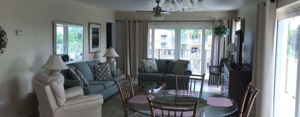 All of the suites at Port Largo Villas are a spacious 1600 square feet, equipped with two large bedrooms, two full bathrooms, full-equipped kitchens, dining area and in-suite washer and dryer. After a busy day out, relax in the living room with a large leather couch, love seat and a comfortable oversized reading chair with ottoman and a wraparound deck with an ocean view.