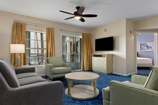 Spacious one- and two-bedroom suites provide comfortable, condo-style accommodations ideal for families or longer stays. Each suite includes a fully equipped kitchen, separate living and dining areas, washer and dryer, multiple televisions, and a private balcony or patio. Thoughtful layouts and home-like amenities allow guests to relax and recharge after busy days exploring Central Florida.