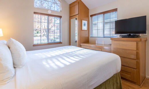 RiverPointe's studio units offer a cozy retreat for two, while the one-bedroom cottages are ideal for up to four guests. Studios include a queen-size bed and kitchenette and one-bedroom units offer a bit more space with a dining area, one queen-size bed and one queen-size sleeper sofa. Both configurations include complimentary Wi-Fi access, flat-screen TV, DVD/CD player and a deck or balcony.