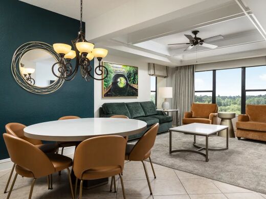 Spacious floor plans and inviting décor create the perfect home-away-from-home at River Island. With a variety of accommodations in all manner of sizes, Orange Lake Resort - River Island is perfect for everyone, be it vacationing couples or families enjoying a getaway. Relax in comfort with one-bedroom units that sleep up to four, two-bedroom units that sleep up to eight, three-bedroom units that sleep up to twelve, and four-bedroom units that sleep up to fourteen. All accommodations have pull-out sofa sleepers and come with full kitchens that include a microwave, dishwasher, and in-suite washer/dryer.
