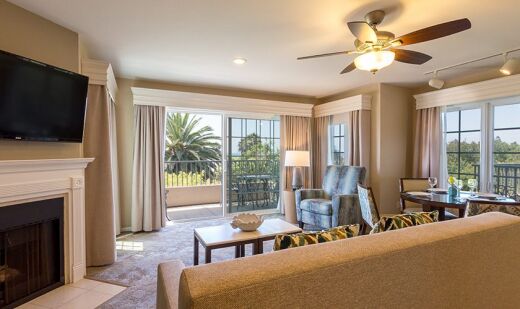The one-bedroom suites at Villa L'Auberge are warm and inviting yet elegant and sleek. A full kitchen and dining room provides a "just like home" dining experience, and the living room is decked out with a flat-screen TV, DVD player, stereo system and cozy fireplace. Between the living room's queen-size pullout sofa and the master bedroom's king-size bed, these villas have enough space to sleep up to four. Take in the sunset from your very own private balcony, and complimentary Wi-Fi keeps you connected at all times.